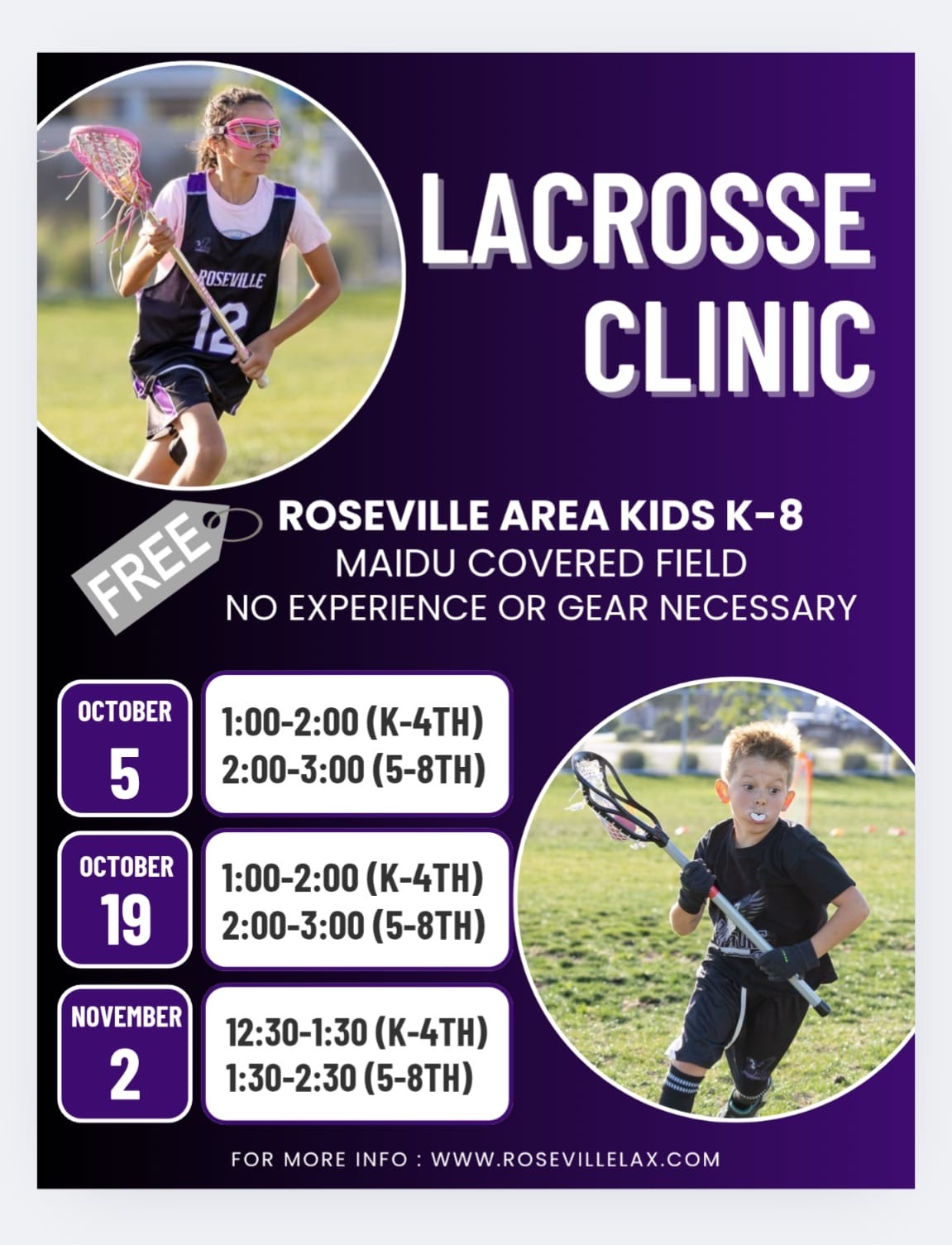 The Roseville Youth Lacrosse Club is offering three free clinics to try out the sport of lacrosse! No equipment needed, sticks and balls will be provided. Our club coaches are running the sessions, rain or shine! Please reach out with any questions. We hope to see you there!